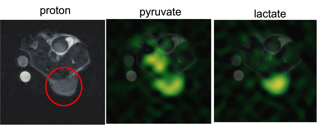 Hyperpolarization is a technology that enhances the signal from tracer molecules by a factor of 10,000-100,000. This makes it possible to image the transport, uptake, and metabolism of dilute tracer molecular and metabolites with MRI. Pyruvate (seen in images above) is a common metabolic probe used to assess rates of glycolytic fermentation in cancer through its conversion to lactate. In the images above, a tumor-bearing mouse (left) shows high levels of pyruvate signal (center) in the large vessels, while high rates of lactate formation are seen within the tumor (right).