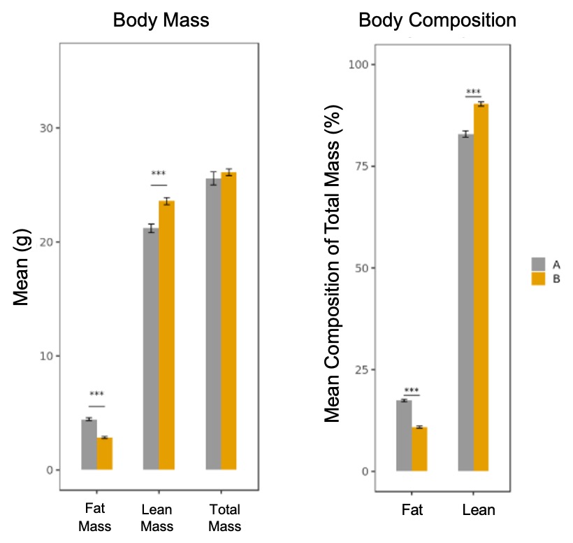 Body composition was measured using the Echo MRI 3-in-1 system and plotted in CalR, with fat, lean, and total mass shown on the left and corresponding percentage composition on the right.