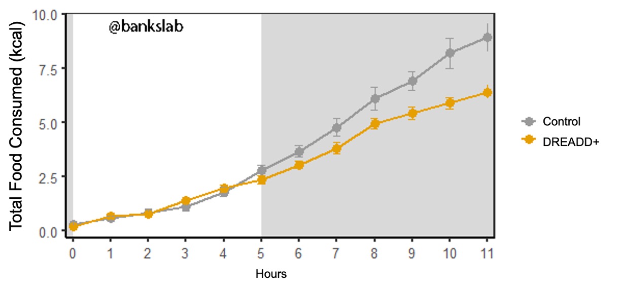 Mice expressing DREADDs and non-DREADD controls were monitored in the Promethion indirect calorimeter, with CNO administered at hour 4 and data plotted in CalR.