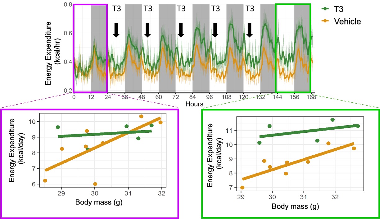 C57Bl/6J male mice were monitored in the Promethion indirect calorimeter, and data were analyzed in CalR to compare energy expenditure between T3-treated and vehicle groups (Hochbaum et al., Cell, 2024).