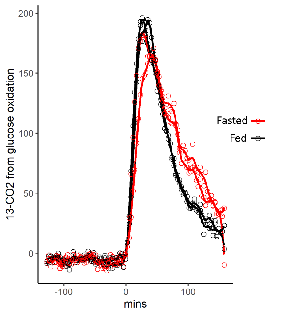 Rates of 13C-glucose oxidation in vivo using stable isotope tracing. C57Bl/6 mice either fasted or were given free access to food for 4 hours prior to administration of 2.5 mg 13C-glucose. Plotted in R & ggplot2. Performed in the Promethion indirect calorimeter.