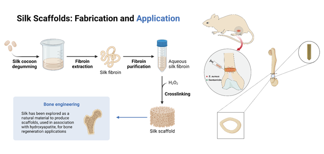 Functionalized Silk Implants: Degradable orthopedic repair devices may have clinically significant benefits over traditional permanent metal devices, by addressing current limitations in bone remodeling, degradation kinetics, and bone integration. New materials and approaches to orthopaedic hardware are required to shift the focus from passive mechanical support to a biologically-oriented integrative approach. We propose a biodegradable silk-based system impregnated with an antibiotic agent that modulates inflammatory response and prevents peri-implant infections.