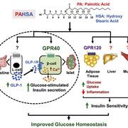 Palmitic acid hydroxystearic acids (PAHSAs) are endogenous lipids with anti-diabetic and anti-inflammatory effects. PAHSA levels are reduced in serum and adipose tissue of insulin-resistant people and high-fat diet (HFD)-fed mice. Here, we investigated whether chronic PAHSA treatment enhances insulin sensitivity and which receptors mediate PAHSA effects. Chronic PAHSA administration in chow- and HFD-fed mice raises serum and tissue PAHSA levels ∼1.4- to 3-fold. This improves insulin sensitivity and glucose tolerance without altering body weight. PAHSA administration in chow-fed, but not HFD-fed, mice augments insulin and glucagon-like peptide (GLP-1) secretion. PAHSAs are selective agonists for GPR40, increasing Ca+2 flux, but not intracellular cyclic AMP. Blocking GPR40 reverses improvements in glucose tolerance and insulin sensitivity in PAHSA-treated chow- and HFD-fed mice and directly inhibits PAHSA augmentation of glucose-stimulated insulin secretion in human islets. In contrast, GLP-1 receptor blockade in PAHSA-treated chow-fed mice reduces PAHSA effects on glucose tolerance, but not on insulin sensitivity. Thus, PAHSAs activate GPR40, which is involved in their beneficial metabolic effects.