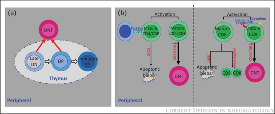3. Double Negative (DN) Cells. CD3positive but CD4 and CD8 negative T cells are expanded in patients with SLE and provide help to B cells to produce anti-DNA antibodies and produce IL-17 and infiltrate the kidney