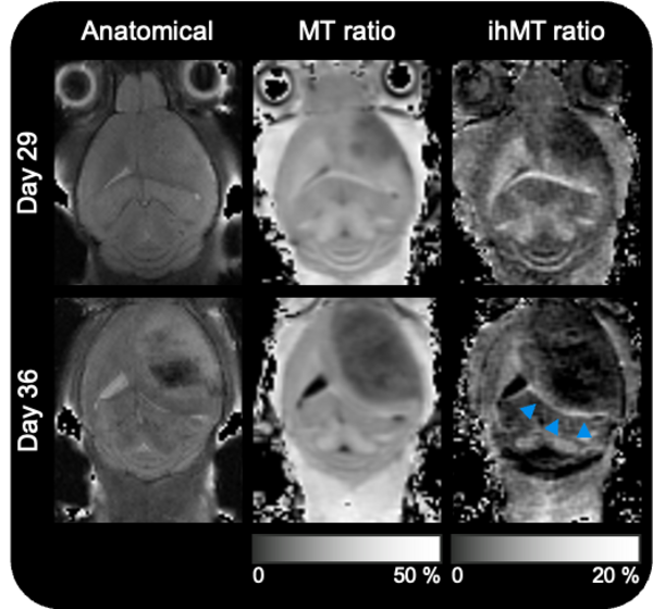 IhMT MRI was applied in a genetic mouse model of glioblastoma to assess the information it can provide on the true extent of tumor infiltration. Non-invasive MRI allowed longitudinal study in which a reduction in peripheral white matter ihMT indicated demyelinating processes associated with glioblastoma. Presented at ISMRM's annual meeting.