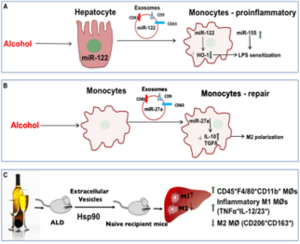 Macrophages (MØ), Kupffer cells (KC), and neutrophils mediate inflammation and play an important role in the pathogenesis of alcohol-associated liver disease (ALD). Previous studies have demonstrated the damaging effects of pro-inflammatory macrophages on alcoholic liver inflammation and high neutrophil infiltration in the liver predicted poor outcomes in human alcoholic hepatitis. Prior reports in humans and our preliminary data in mice show that both classically activated inflammatory and alternatively activated macrophages are present in the liver after chronic alcohol intake. However, the significance of macrophage (MØ) phenotypes or therapeutic targeting of MØ is yet to be explored in ALD. M2 “alternatively activated” macrophages have anti-inflammatory functions and contribute to tissue repair. M2 MØ phenotype is induced and modulated (regulated) by various factors including cytokines, microRNAs, transcription factors, or phagocytosis of apoptotic neutrophils. We found decreased phagocytic activity in alcohol-exposed MØ and observed decreased apoptosis in neutrophils isolated from livers of chronic alcohol-fed mice. Thus, we hypothesize that insufficient M2 polarization permits chronic inflammation and preferential M1 macrophage phenotype in the liver.