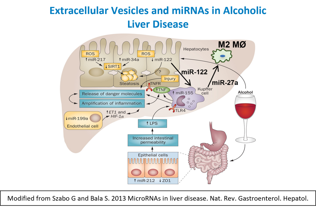 Alcoholic liver disease affects millions of people worldwide and it remains to be a therapeutic challenge for clinicians. Activation of the inflammatory cascade via gut-derived lipopolysaccharide (LPS) contributes to alcoholic liver disease via induction of pro-inflammatory cytokines induction in Kupffer cells. Micro-RNA-155 (miR-155), small non-coding RNA molecule, is important in regulation of inflammation. Our studies demonstrated that chronic alcohol up-regulates miR155 in macrophages in vitro as as as in vivo in the liver and in isolated Kupffer cells and this miR155 increase contributes to inflammation in alcoholic liver disease. We recently reported that miR-155 deficient mice are partially provoked with alcohol induced liver damage and fibrosis. Our studies on miR-155 revealed a critical role for reducing miR-155 in hepatocytes in the progression of alcoholic liver disease.