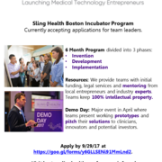 Sling Health Boston is a non-profit biotechnology and healthcare incubator program based at Harvard and MIT. Sling Health brings together students and postdocs across all of Boston to develop and commercialize solutions for real world clinical problems.
