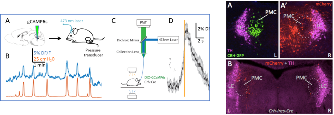 Prior studies identify brain/spinal cord regions involved in controlling bladder function, but often do not resolve neuronal subpopulations or their specific connections. We seek to develop in mice a complete circuit map of the control of bladder filling and voiding. Prior work and our own preliminary data identified the Pontine Micturition Center (PMC) and its large population of corticotropin releasing hormone (CRH) positive neurons (PMC-CRH) as the likely driver neurons of voiding. Our data shows that PMC-CRH neurons stimulate conscious voiding and bladder contractions under anesthesia when fired opto- or chemo-genetically. Selective ablation of PMC-CRH (Cre-driven expression of dipthteria toxin) eliminates voiding and normal bladder contractions on cystometrogram (CMG). Finding that PMC-CRH are the key PMC neurons driving voiding, we hae sought neurons which connect to them and modulate their activity. We have linked PMC-CRH neurons and multiple other brain sites, including specific populations of neurons in the periaqueductal gray (PAG) and the lateral preoptic area and lateral hypothalamic area (LPOA and LHA).