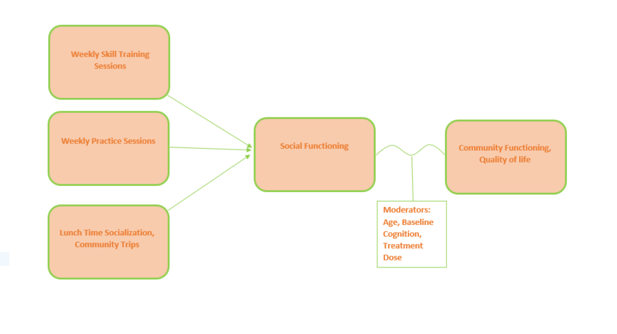 A manualized year-long rehabilitation program, with weekly skills classes supervised by a clinician and monthly community practice trips. Classes use SST principles: modeling, role playing, positive and corrective feedback, homework assignments. The curriculum has seven modules: Living Independently in the Community, Communicating Effectively, Making and Keeping Friends, Making the Most of Leisure Time, Using Medications Effectively, Healthy Living, and Making the Most of a Doctor’s Visit. Each module includes 6-8 component skills, with one skill taught each week in two sessions (normally morning and afternoon of the same day): a 90-minute session focused on a specific skill and a 60-minute session in which the skill is used in role-play exercises. A lunch break encourages socializing and semi-monthly community trips develop skills related to the module topics. Participants receive workbooks summarizing the skill areas and providing home practice assignments.