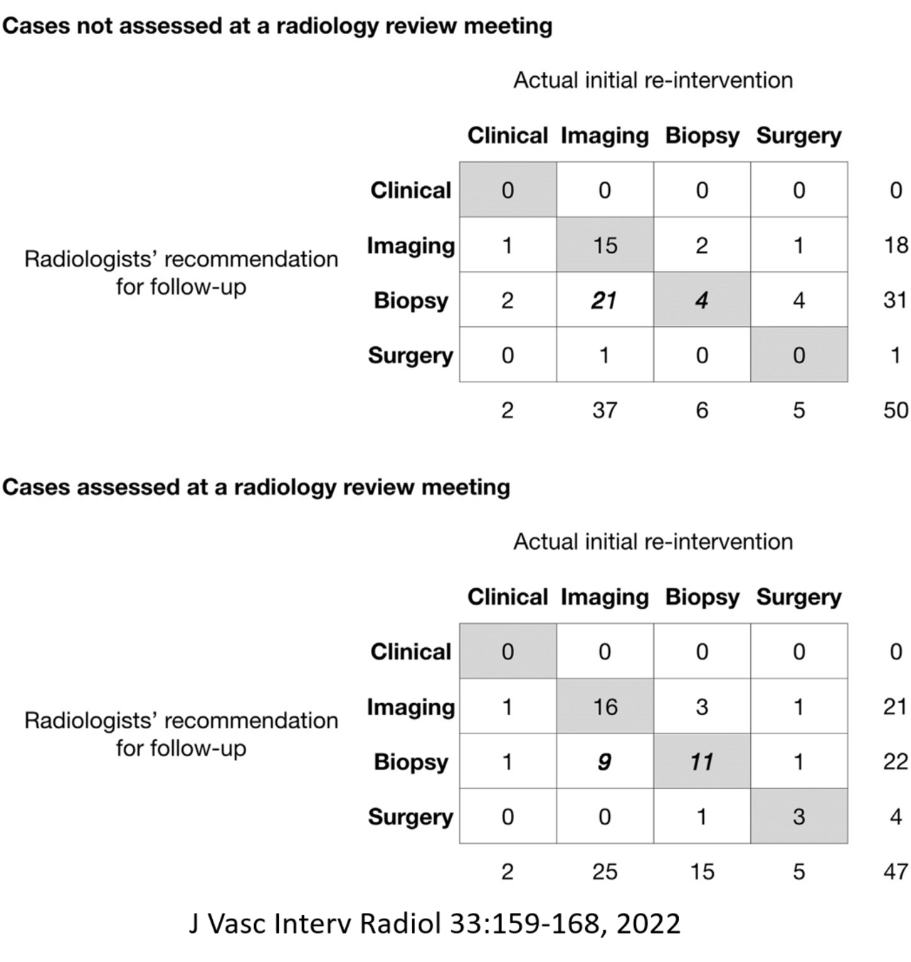 We retrospectively reviewed discordant cases that were not assessed at a radiology review meeting and compared those with cases that had been reviewed.