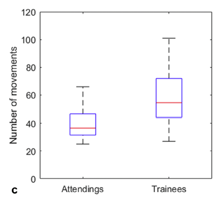 The time, path length, and number of movements were all lower for experienced attendings as compared with trainees, demonstrating the sensitivity of the system to motions associated with the IR procedures and the ability to differentiate the motions of experts versus trainees.