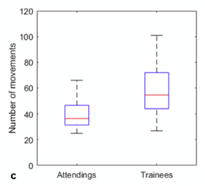 The results demonstrated that the metrics for the probe motion were different for junior and senior trainees, demonstrating improvement in this aspect of the procedure during residency. However, that was not the case for the needle hand motion, where no difference was found between junior and senior trainees (and both being different than the motion of experts). These results suggest that further attention be paid to training the needle movements during training. (ref abstract)