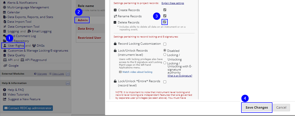- Click on the name of the role to grant delete rights ("Admin" shown below).