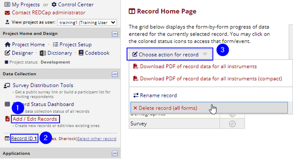 - Click "Choose action for record", and select "Delete record (all forms)" from the drop down menu.