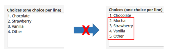 This is the wrong way to add a new choice such as "Mocha". All of the records that had "Strawberry" as the favorite ice cream would have their answer converted to "Mocha". Likewise, all of the "Vanilla" answers would be converted to "Strawberry". This would have a huge negative impact on the project's data integrity.