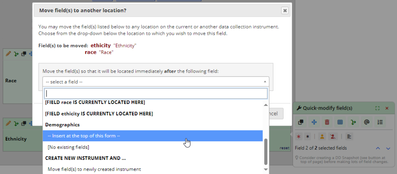 Move has several new features- first, it is easy to move several fields at once using the checkboxes. Then, fields can be moved to a blank instrument (previously, at least one placeholder field had to be created in order to move fields to a new form). Finally, there is now the option to create a new instrument on the fly during a move.