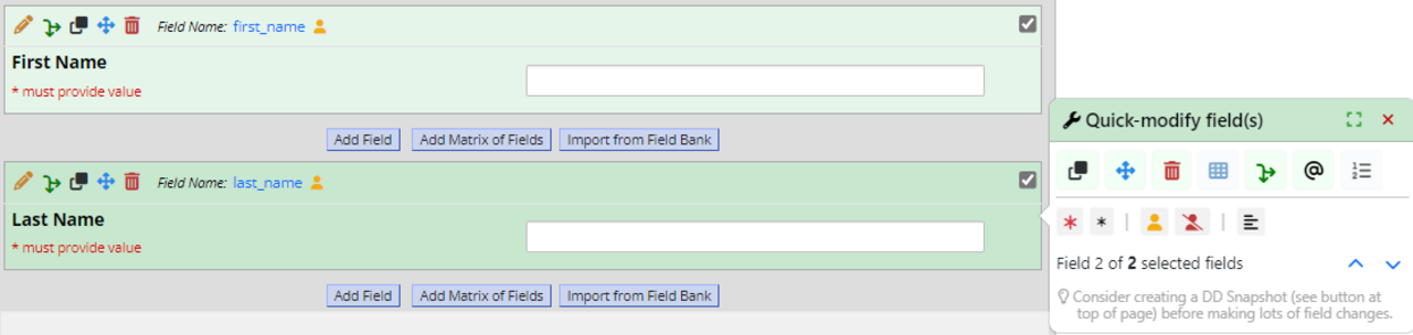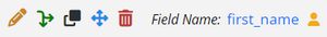 In the Designer, the icons in the upper left will be updated. New functionality includes being able to click on a blue field name (aka variable name- first_name below) to copy that field name to the clipboard for use in later branching logic or piping. Also, any field tagged as an identifier will have a gold person icon to flag it visually.