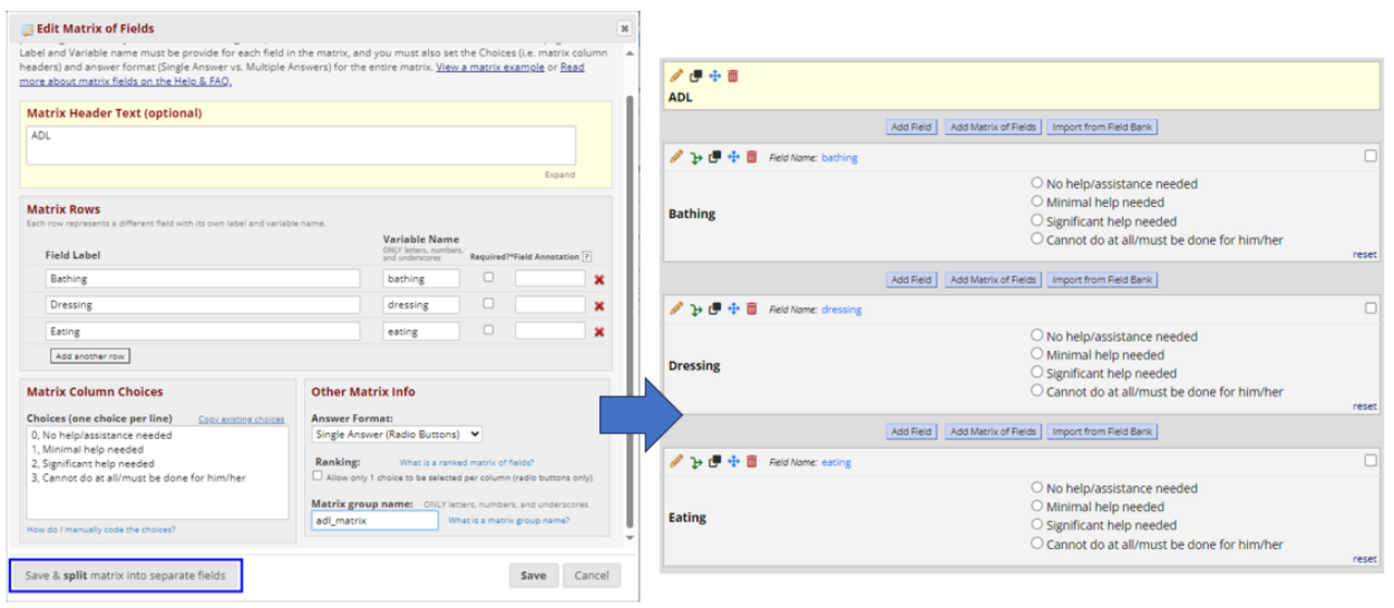 Until now, a field matrix could not be split apart in the online designer without re-creating the fields or downloading and editing the data dictionary. With the upgrade, a new new option appears in the bottom left of the matrix box- "Save & split matrix into separate fields".