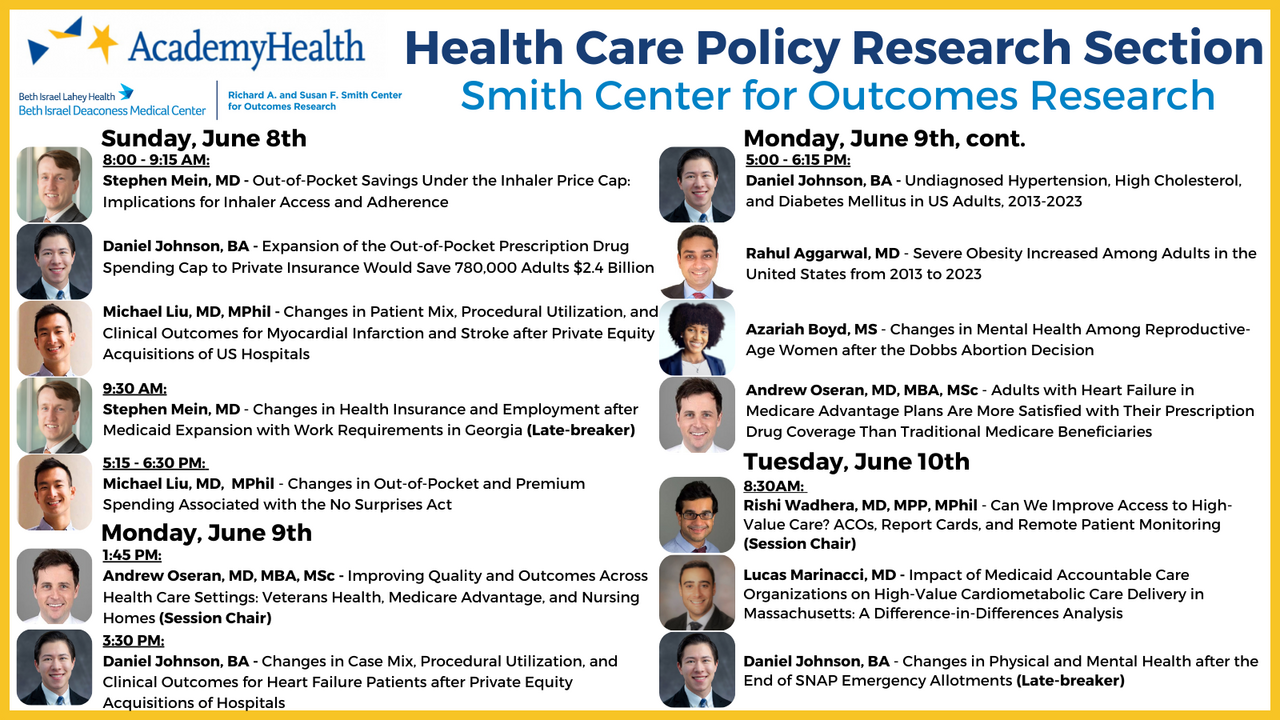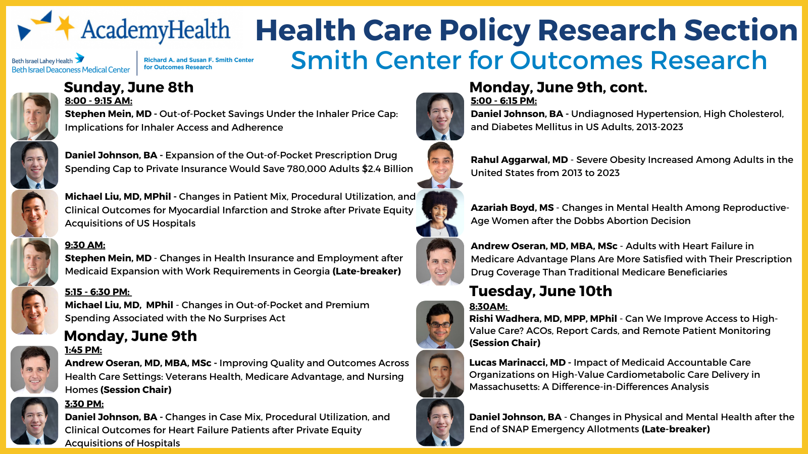Daniel Johnson, BA presented his work on changes in case mix, procedural utilization, and clinical outcomes for heart failure patients after private equity acquisitions of hospitals. Findings were simultaneously published in JACC. Daniel Johnson, Michael Liu, Victoria Bartlett, ZhaoNian Zheng, Andrew Oseran, Rishi Wadhera.