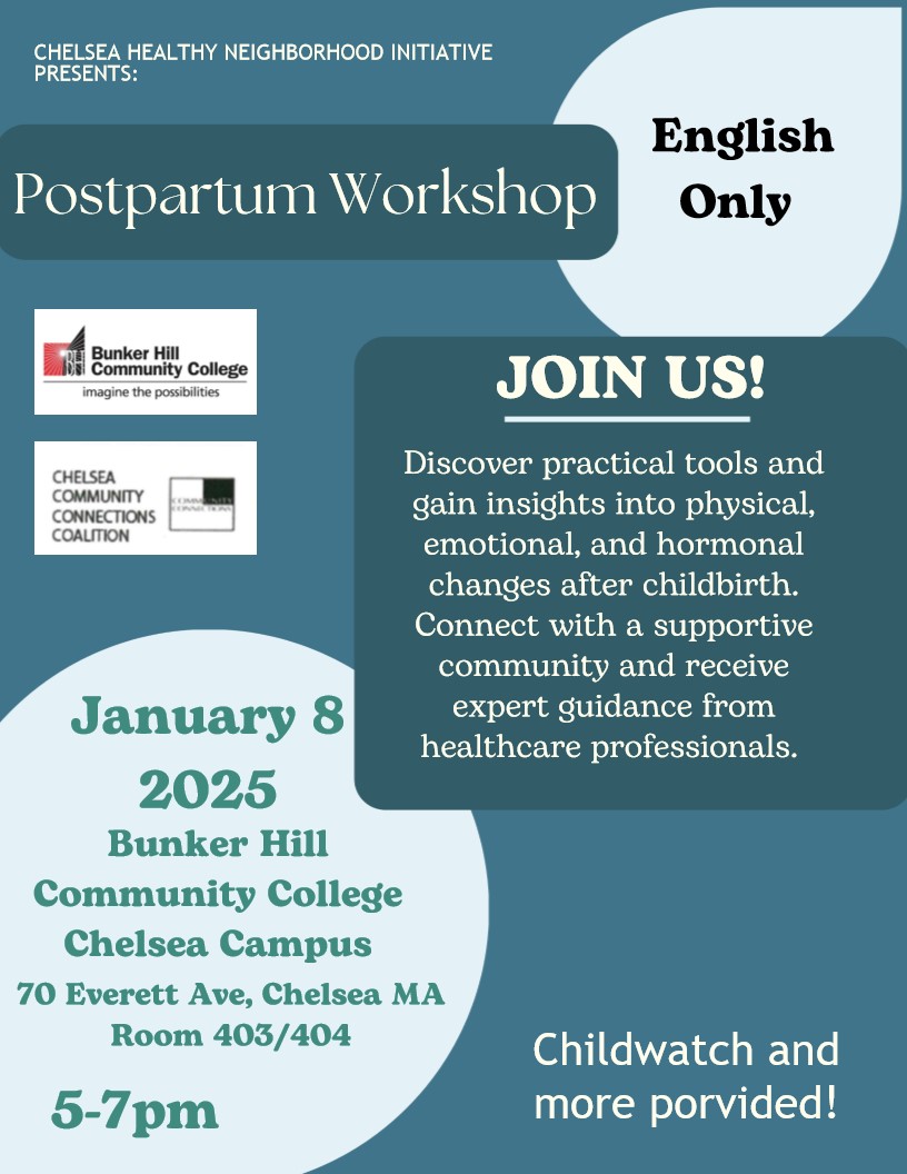 Date Wednesday, Jan 08, 2025, 06:00pm - Wednesday, Jan 08, 2025, 08:00pm Chelsea, MA Chelsea Healthy Neighborhoods Initiative Chelsea Community Connections Website