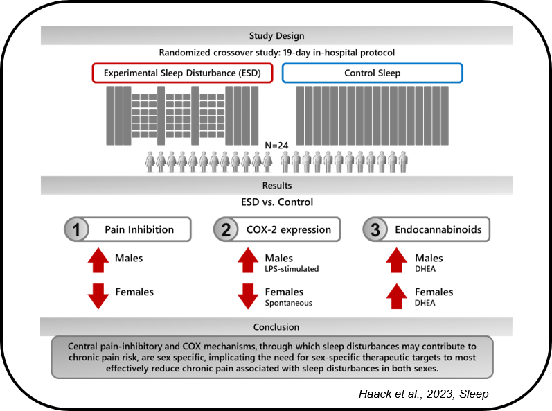 c) Summary: Knowledge on sex-differential activations of pain pathways by sleep disturbances has important therapeutic implications and may require different mechanism-based therapies to treat pain in both sexes effectively. The development of specific therapeutics that complement traditional sleep-improving therapies has the potential to better mitigate pain associated with sleep disturbances and interrupt the transition to pain chronicity in both sexes.