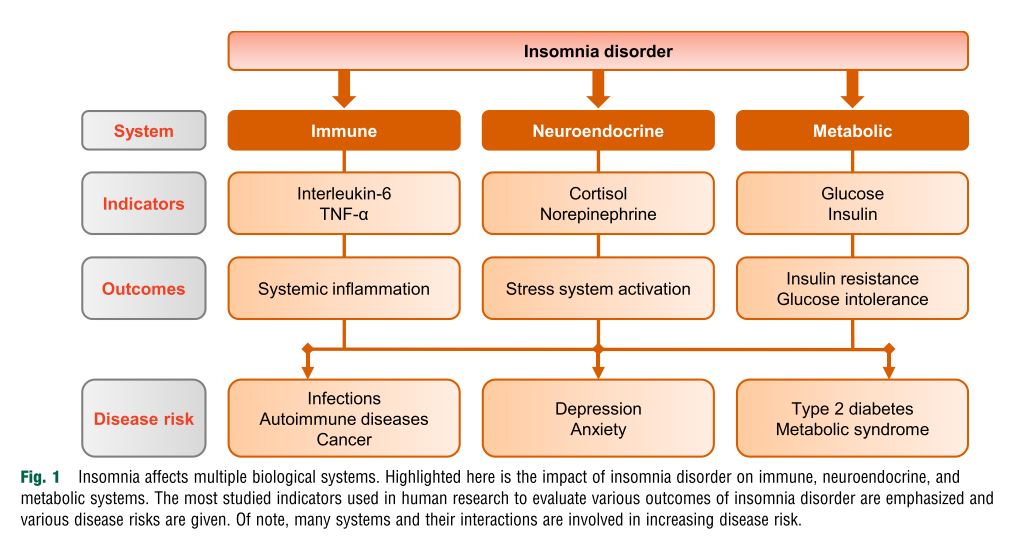 Fig. 1 depicts immune, neuroendocrine, and metabolic consequences associated with insomnia disorder and their potential role in mediating increased disease risk, which will be reviewed in the following. Autonomic consequences of insomnia (e.g., blood pressure, heart rate variability) will not be discussed here; the interested reader is referred to recent comprehensive reviews (Grimaldi et al., 2019; Nano et al., 2017).