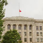 Harvard Medical School flag lowered to honor the late Dr. Warner Slack.